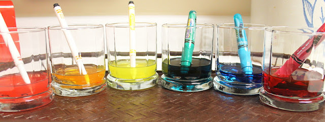 without any water color paints on hand, i dug through some old school supplies and found a few markers that were on their last leg. instant, free paint? i think so!once the markers had lost all their color to osmosis, i simply placed the beads in the water overnight. and woke up to each of the baubles happily dyed. [note: i did have to touch up a few with watered down markers to get the hue i was looking for.]